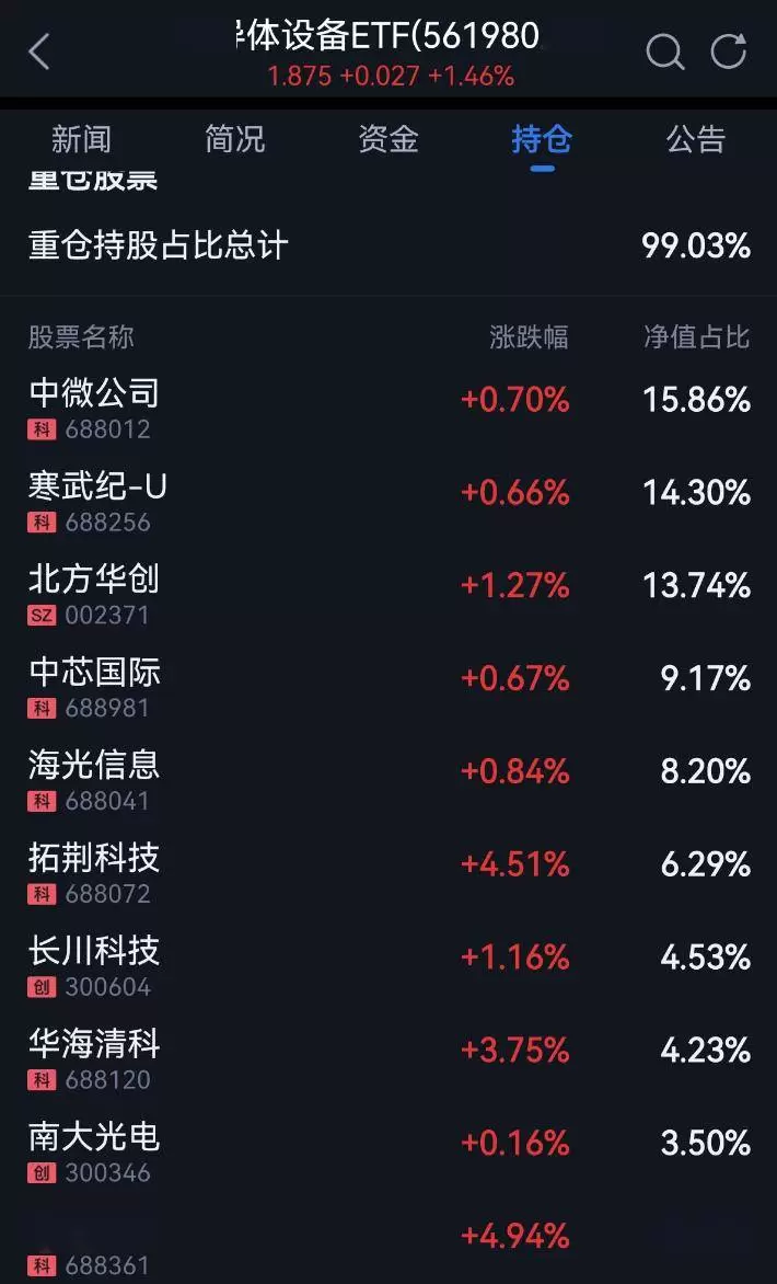 场内关注度较高的半导体设备ETF(561980)跟踪中证半导,标的指数中半导体设备、材料和集成电路设计三行业占比超过90%,中微公司、北方华创、寒武纪、中芯国际、海光信息等前十大占比超78%,指数弹性较为突出,或可借道布局新一轮半导体上行周期,分享产业自主可控成长红利。